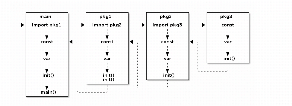 我们可以看出,初始化可以分为2部分来看,首先包的初始化顺序,然后是单个包初始化顺序,首先包的初始化顺序和包的导入方式有关,如果一个包被导入多次,只会初始化一次,然后单个包的初始化顺序是const常量,变量,然后是init()函数。
