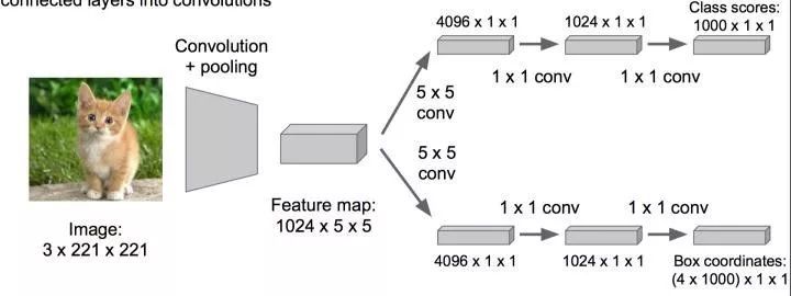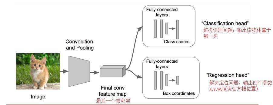 *在上述神经网络的尾部展开(也就说CNN前面保持不变,我们对CNN的结尾处作出改进:加了两个头:“分类头”和“回归头”)