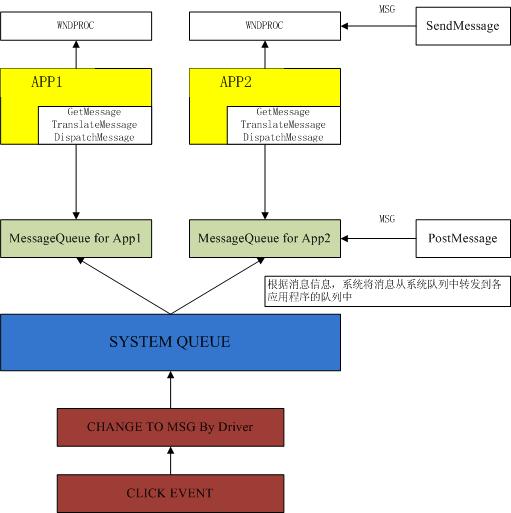 1. 鼠标点击,产生单击事件,鼠标设备驱动程序根据用户事件,转换成消息,并放置于WINDOWS的系统队列中