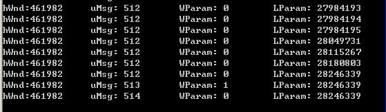 sprintf_s(buf, 1024, "hWnd:%d uMsg: %d WParam: %d LParam: %dn",