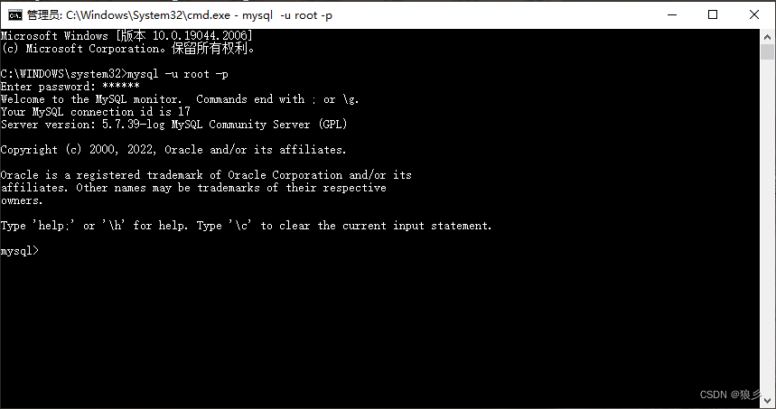 已管理员身份运行CMD命令,执行命令mysql -u root -p,再输入安装时配置的密码,运行成功。