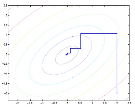 图中的直线式迭代优化的路径,可以看到每一步都会向最优值前进一步,而且前进路线是平行于坐标轴的,因为每一步只优化一个变量。