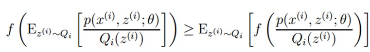 本质上我们是需要最大化(1)式(对(1)式,我们回忆下联合概率密度下某个变量的边缘概率密度函数的求解,注意这里z也是随机变量。对每一个样本i的所有可能类别z求等式右边的联合概率密度函数和,也就得到等式左边为随机变量x的边缘概率密度),也就是似然函数,但是可以看到里面有“和的对数”,求导后形式会非常复杂(自己可以想象下log(f1(x)+ f2(x)+ f3(x)+…)复合函数的求导),所以很难求解得到未知参数z和θ。那OK,我们可否对(1)式做一些改变呢?我们看(2)式,(2)式只是分子分母同乘以一个相等的函数,还是有“和的对数”啊,还是求解不了,那为什么要这么做呢?咱们先不管,看(3)式,发现(3)式变成了“对数的和”,那这样求导就容易了。我们注意点,还发现等号变成了不等号,为什么能这么变呢?这就是Jensen不等式的大显神威的地方。