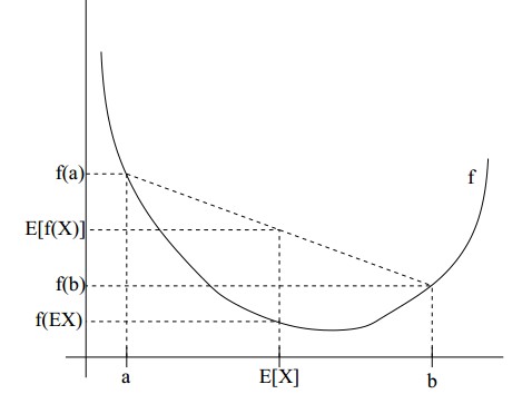 图中,实线f是凸函数,X是随机变量,有0.5的概率是a,有0.5的概率是b。(就像掷硬币一样)。X的期望值就是a和b的中值了,图中可以看到E[f(X)]>=f(E[X])成立。