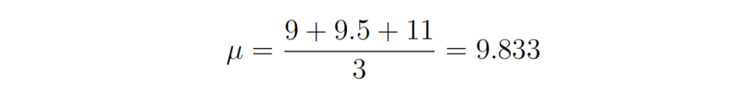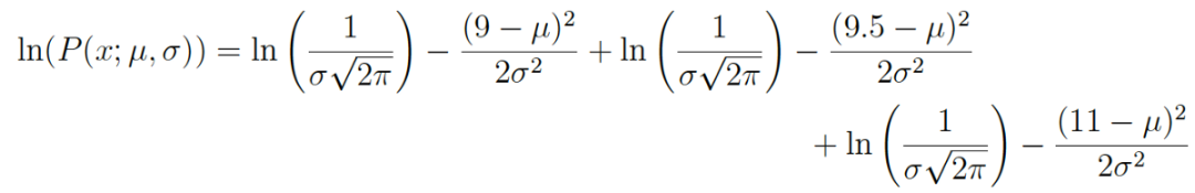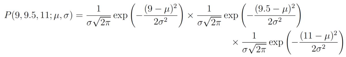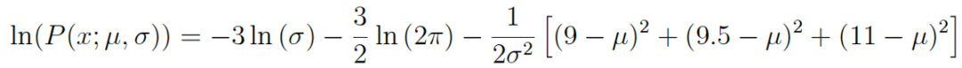 我们同样将用一个例子来演示这个过程。假设这次有三个数据点,我们假设它们是从一个被高斯分布充分描述的过程生成的。这些点是 9、9.5 和 11。那么如何用最大似然估计逼近这个高斯分布的参数 μ 和 σ 呢?