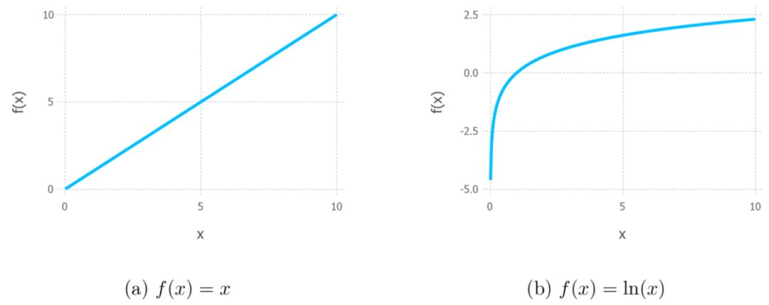 原函数的单调性,左边是 y = x,右边是(自然)对数函数 y = ln(x)。