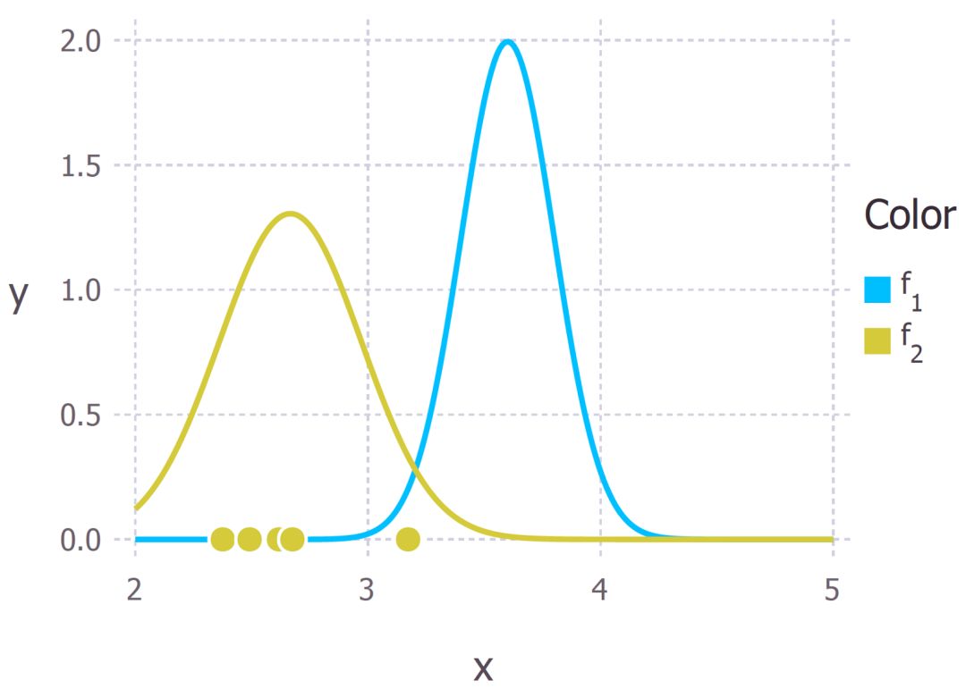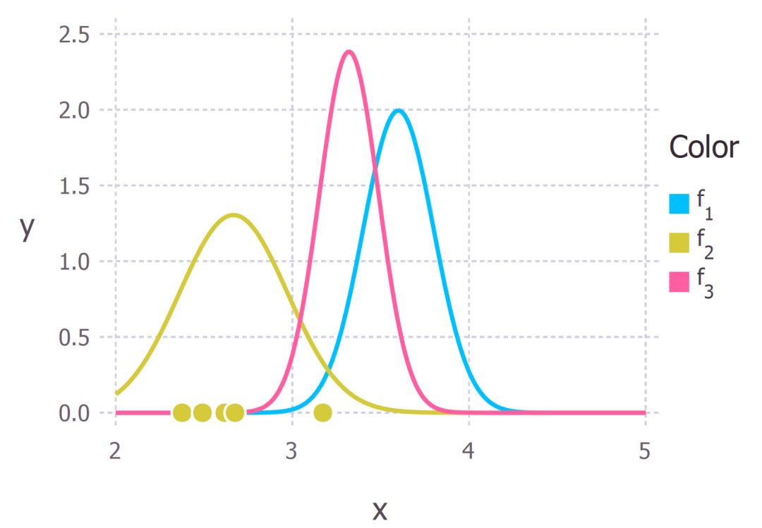 我们现在选取一些数据(由均值为 3Å 和标准差为 0.4Å 的高斯分布随机生成的 5 个数据点),代表了氢键的测量长度(图 3 中的黄色点)。我们可以从这些数据点中推导出似然度分布,即下图中黄色线表示的似然度分布。注意从这 5 个数据点得到的最大似然度估计小于 3Å(大约 2.8Å)。