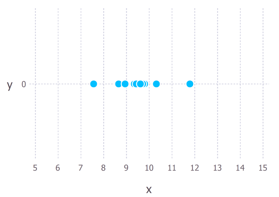 假设我们从某个过程中观察了 10 个数据点。例如,每个数据点可以代表一个学生回答特定考试问题的时间长度(以秒为单位)。这 10 个数据点如下图所示: