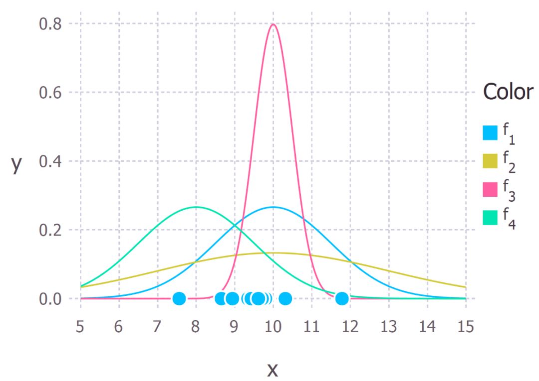 10 个数据点和可能得出这些数据的高斯分布。f_1 是均值为 10、方差为 2.25(方差等于标准偏差的平方)的正态分布,也可以表示为 f_1∼N(10, 2.25)。其它曲线为 f_2∼N(10, 9)、f_3∼N(10, 0.25)、f_4∼N(8,2.25)。最大似然的目标是找到最有可能生成已知观察数据分布的参数值。