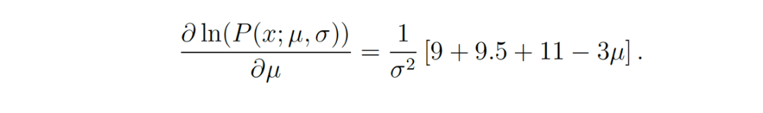 这个表达式可以通过求导得到最大值。在这个例子中,我们要找到平均值 μ。为此我们对函数求 μ 的偏导数,得到: