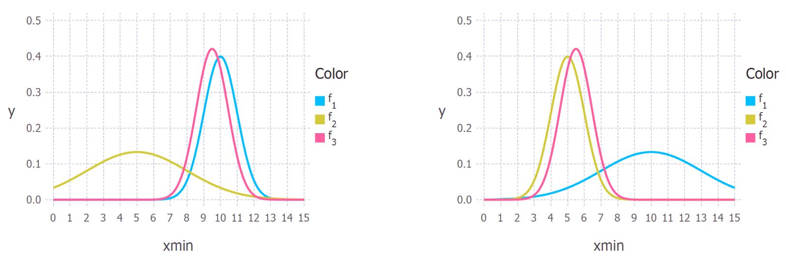 先验与似然上的权重数量取决于两个分布之间的相对不确定性。在下图中我们可以看到这一点。颜色与上面一样,蓝色表征先验分布,黄色表征似然分布,粉红表征后验分布。左图中我们看到蓝线不如黄线那么延展。因此后验要远比似然更相似于先验。右图中则情况相反。