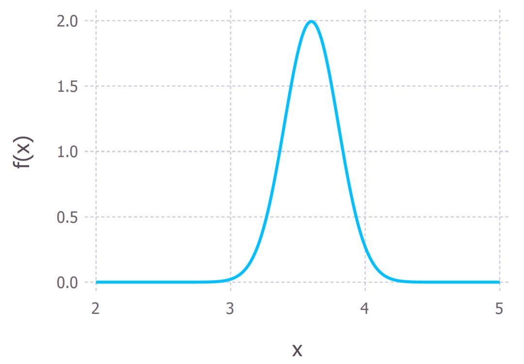 以上例子使用的都是离散概率,有时可能需要使用连续的概率分布。即卖出冰淇淋的概率可能不只是 0.3,还可能是 0.25 或 0.4 以及其它任何可能值,每个概率对应一个先验信念,因而是一个函数 f(x),如下图所示。该分布被称为先验分布(prior distribution)。