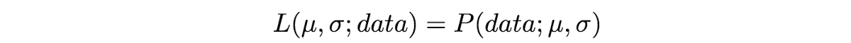 这两个表达式是相等的!所以这是什么意思?我们先来定义 P(data; μ, σ) 它的意思是「在模型参数μ、σ条件下,观察到数据 data 的概率」。值得注意的是,我们可以将其推广到任意数量的参数和任何分布。