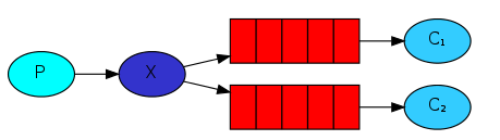 P 表示为生产者、 X 表示交换机、C1C2 表示为消费者,红色表示队列。