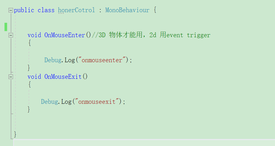 OnMouseEnter(),OnMouseExit()都是通过collider触发的,且碰撞器不能是trigger,鼠标进入,或离开collider时,自动调用这两个函数。