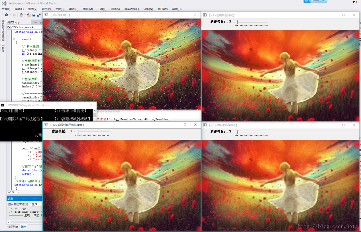 对于三种滤波算法,opencv提供了封装好的函数,分别是medianBlur(),blur(),GaussianBlur().值得借鉴和参考。