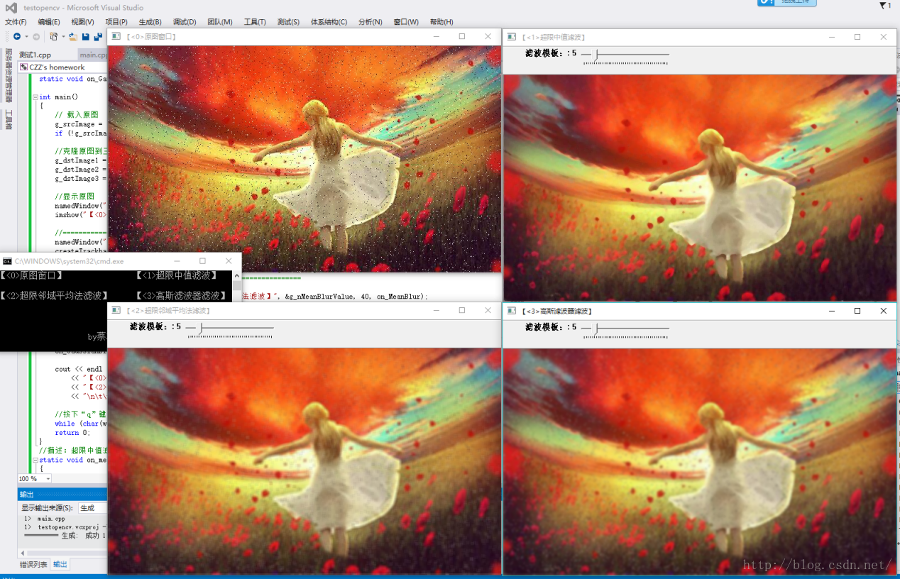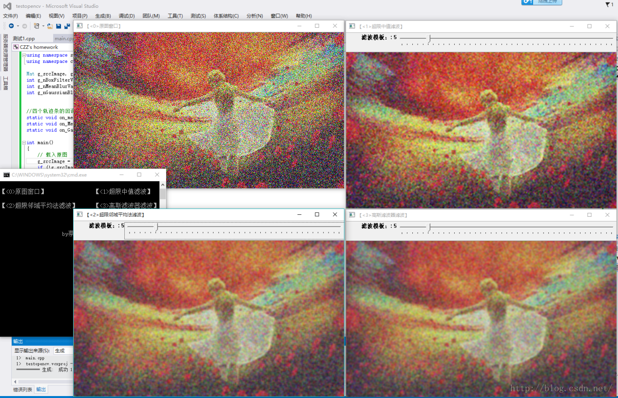 原本是想用MFC整合成一个程序的,后来考虑到要设计成多种模板,便将加噪声和滤波分开写,这样效果更明显。对于加噪声这个程序,遇到的困难之一在于不理解随机噪声和椒盐噪声的区别,网上的相关资料太少,查阅老师的课件也觉得两者的效果是差不多的,我觉得这点区别在程序中很难体现,只能依靠自己的理解来区别这两种算法。第二个难题是高斯噪声的实现,原本想要写高斯分布函数来实现的,以图像的中点为期望值向四周分布,实现后发现想法是错误的。最后借鉴了维基百科的算法,通过Box-Muller变换可以产生Gaussian噪音。第三个难题是如何保存处理后的图像,本程序用的图像类型是cv::Mat,因此应该调用imwrite()函数,但是程序停止工作,而将cv::Mat转换成const cvArr*类型后,调用cvSaveImage()函数,程序也停止工作。后来尝试抛出异常处理,发现异常并未抛出,程序的确保存图片了,只是保存的图片格式有错。网友断言,这是imwrite()这个函数本身的原因。对于滤波程序的实现,最大的收获是学会了使用轨迹条,原本是想通过数组固定几种模板的,后来发现使用轨迹条可以自由的选择滤波模板参数,当然在参值的传递那里遇见了很多困难,最终还是一一克服了。其实这个作业在以前李豪杰老师的多媒体设计导论课上也做过,也研究过滤波的几种算法,是基于MFC框架进行编程的。而这一次,用的是opencv,很多算法的实现都有现成的封装函数。完成这一部分的作业花了一整天的时间,说真心话,刚开始是有点懊悔的,比重10分的东西花了一整天,感觉完成大作业更是遥遥无期了。但是不可否认,今天真的学到了很多,可以说是从无到有的转变。真的非常庆幸选择了树莓这个专业方向。