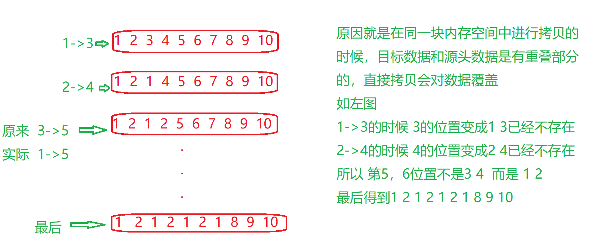 问题:如果要在同一个数组里面对进行拷贝,memcpy是实现不了的,假设要把arr1里的1 2 3 4 5拷贝到3 4 5 6 7的位置,就会出现一下结果