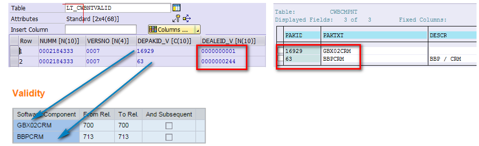 Contains note validity information. In this information, component key: 16929, we can find its description from table CWBCMPNT. And 63 for BBPCRM.