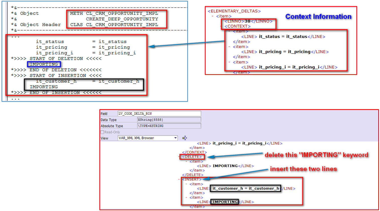 The area below marked with blue rectangle is the code delta change our customer could see in the note browser, and the red area is part of variable lv_code_delta_bin inspected via XML Browser. The delta code change consists of two parts: