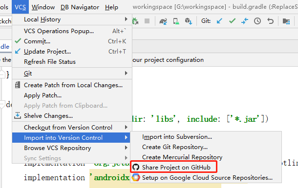 8.使用远程仓库简单(github),基本省的敲击命令去上传项目,as内部可以创建,上传,更新分支等等功能: