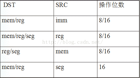 解释一下:mem(主存),imm(立即数),reg(寄存器),seg(段寄存器),DST(目的操作数),SRC(源操作数)。(以后都这样)。