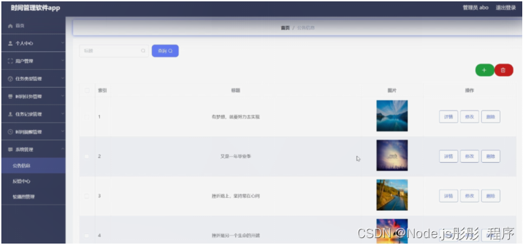 系统管理,在公告信息页面可以对索引、标题、图片等内容进行详情、修改或删除等操作;还可以对反馈中心,轮播图管理进行相应操作;如图5-16所示。