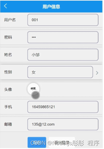 用户信息,在用户信息页面通过填写用户名、密码、姓名、性别、头像、手机、邮箱等详细信息进行保存操作,如图5-8所示。