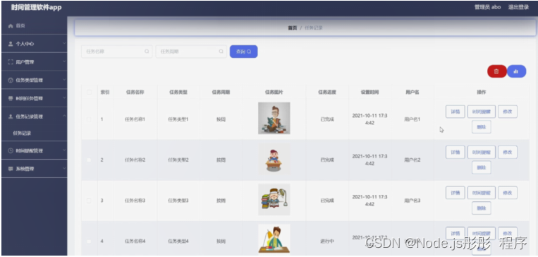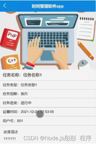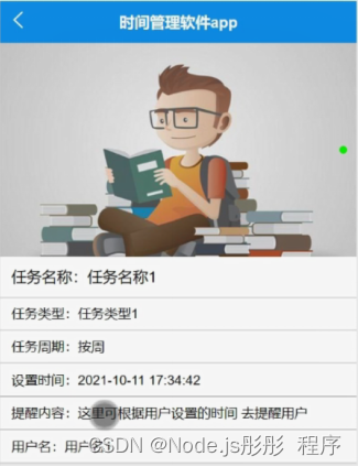以上就是碧蓝小兔子最近收集整理的关于计算机毕业设计Node.js+Vue时间管理软件app(程序+源码+LW+部署)第5章 系统实现的全部内容,更多相关计算机毕业设计Node.js+Vue时间管理软件app(程序+源码+LW+部署)第5章内容请搜索靠谱客的其他文章。