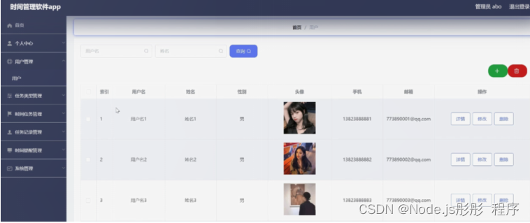 用户管理,在用户管理页面可以对索引、用户名、姓名、性别、头像、手机、邮箱等内容进行详情、修改或删除等操作,如图5-11所示。