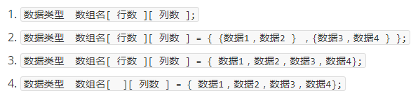 //数据类型 数组名[][列数] = { 数据1,数据2 ,数据3,数据4 };