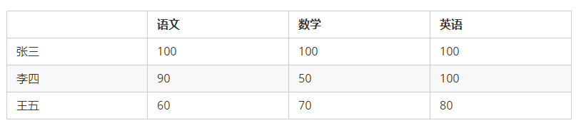 案例描述:有三名同学(张三,李四,王五),在一次考试中的成绩分别如下表,请分别输出三名同学的总成绩