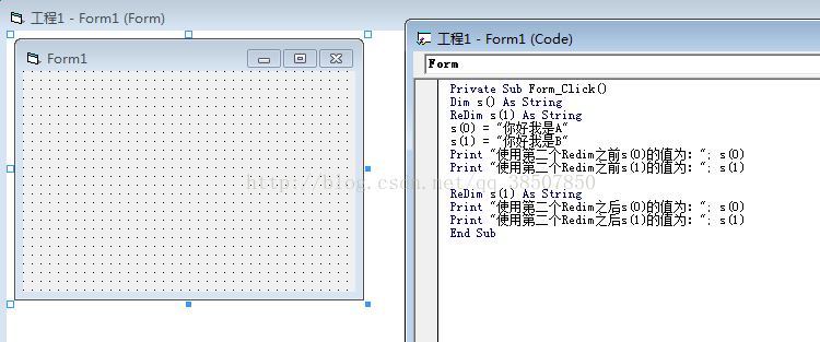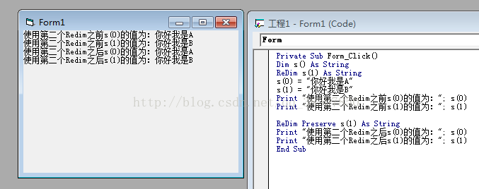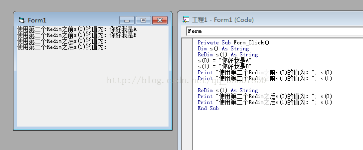 第一次Redim,对动态数组s()定制了上下界和维度,并马上对数组赋予了初值,第二次重新定制了数组s()的上界和维度,虽然两次定义的上下界和维度是一样的,但是数值却没有保存下来,执行代码的结果如下: