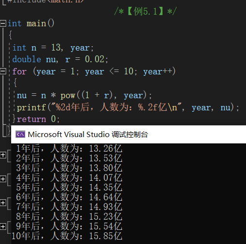 printf("%2d年后,人数为:%.2f亿n", year, nu);
