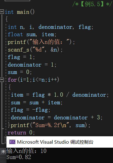- 需要重复执行的语句组成了循环体,本例中循环体部分是重复计算item,然后将其值与要求的精度进行比较,决定是否结束循环