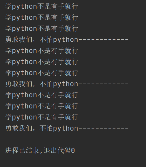 print('勇敢我们,不怕python------------')