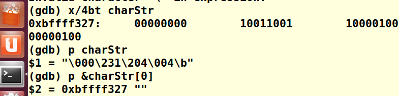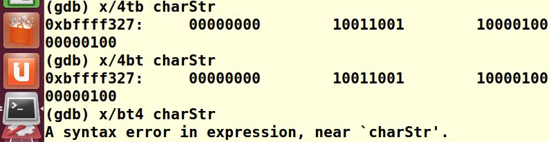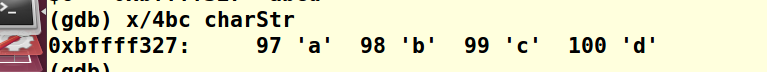 这里已经按照 x/nsf address的格式对内容进行了输出,从地址0xbffff327开始向后 读取4个单位 每个单位一个字节 以2进制输出