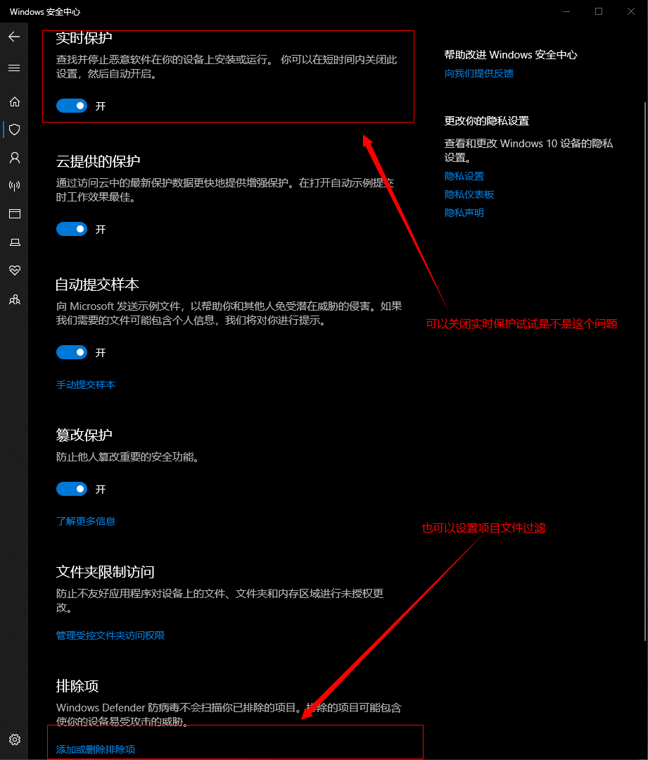 IDEA2019.4以及之后的版本提供了一个程序自动将项目添加到window10这个排除选项中的,具体可以到IDEA官网文档查询,一般都不会是这个问题,除非你写的是病毒程序或者疑似病毒程序。如果项目没添加过滤,在启动时默认提示你去开启官方提供的软件自动添加当前项目下的所有文件到Window10的排除项中。