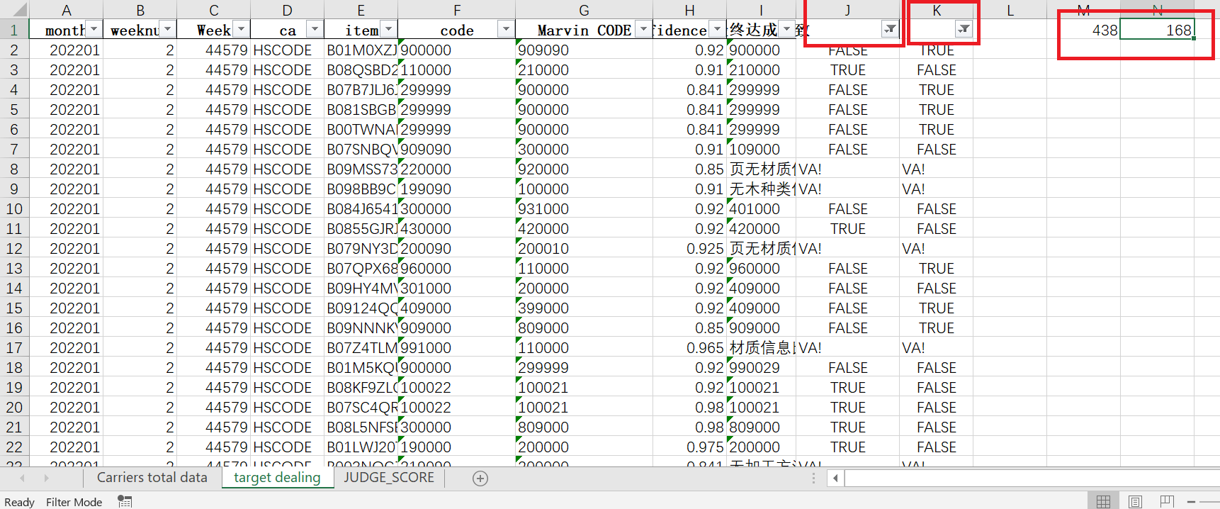 如下有一张总表,需在B列和C列满足特定条件的情况下,把A:I列复制到“Target_dealing”表,然后在这张表新增J,K两列,J列使用EXCCEL公式显示G列和I列同行值是否相同,K列使用EXCEL公式显示F列和I列同行值是否相同,计算J列为“FALSE”(不同)的个数填入单元格M1,计算K列为“FALSE”填入单元格N1。