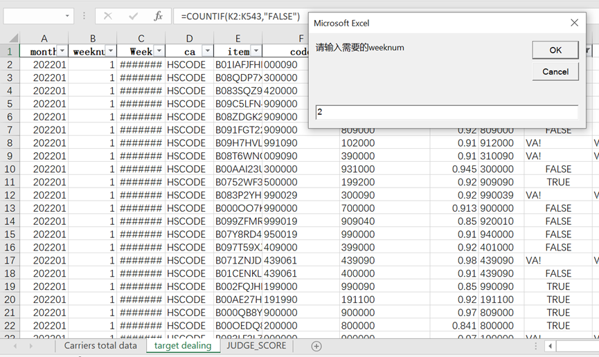 这里在第三张表填写了需要判断的条件,读取到VBA再次循环第二张表,在J列等于FALSE, H列等于0.98时,计数器+1。最后就得到需要的值了。