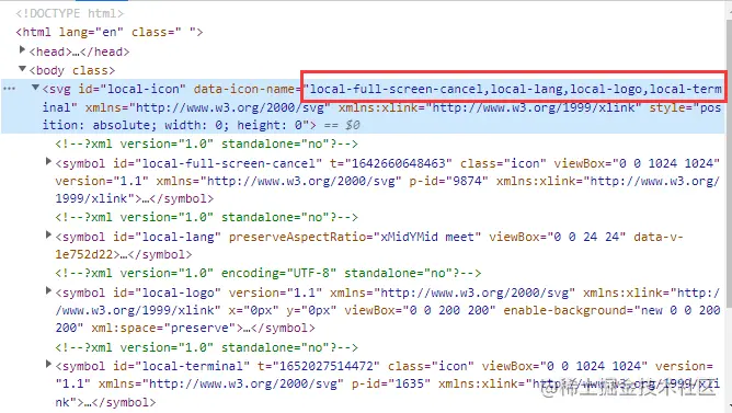 在实现Icon组件时,我们已经导入了所有的本地SVG文件的内容到项目内,导入后,页面加入的svg元素类似这样: