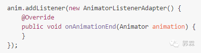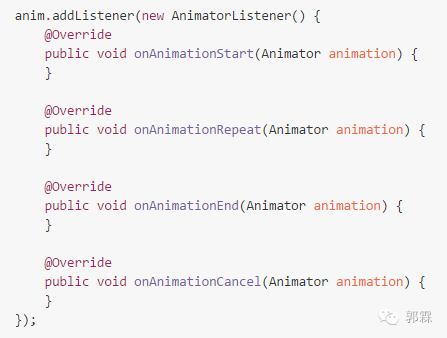 这里我们向addListener()方法中传入这个适配器对象,由于AnimatorListenerAdapter中已经将每个接口都实现好了,所以这里不用实现任何一个方法也不会报错。那么如果我想监听动画结束这个事件,就只需要单独重写这一个方法就可以了,如下所示:
