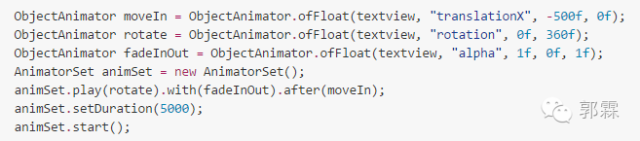 好的,有了这四个方法,我们就可以完成组合动画的逻辑了,那么比如说我们想要让TextView先从屏幕外移动进屏幕,然后开始旋转360度,旋转的同时进行淡入淡出操作,就可以这样写: