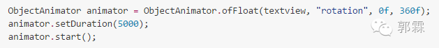 学会了这一个用法之后,其它的用法我们就可以举一反三了,那比如说我们想要将TextView进行一次360度的旋转,就可以这样写: