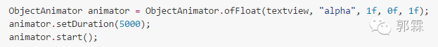 其实这段代码的意思就是ObjectAnimator会帮我们不断地改变textview对象中alpha属性的值,从1f变化到0f。然后textview对象需要根据alpha属性值的改变来不断刷新界面的显示,从而让用户可以看出淡入淡出的动画效果。
