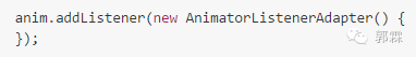 但是也许很多时候我们并不想要监听那么多个事件,可能我只想要监听动画结束这一个事件,那么每次都要将四个接口全部实现一遍就显得非常繁琐。没关系,为此Android提供了一个适配器类,叫作AnimatorListenerAdapter,使用这个类就可以解决掉实现接口繁琐的问题了,如下所示: