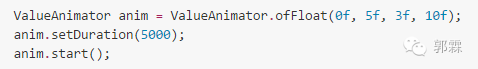 怎么样?很简单吧,调用ValueAnimator的ofFloat()方法就可以构建出一个ValueAnimator的实例,ofFloat()方法当中允许传入多个float类型的参数,这里传入0和1就表示将值从0平滑过渡到1,然后调用ValueAnimator的setDuration()方法来设置动画运行的时长,最后调用start()方法启动动画。
