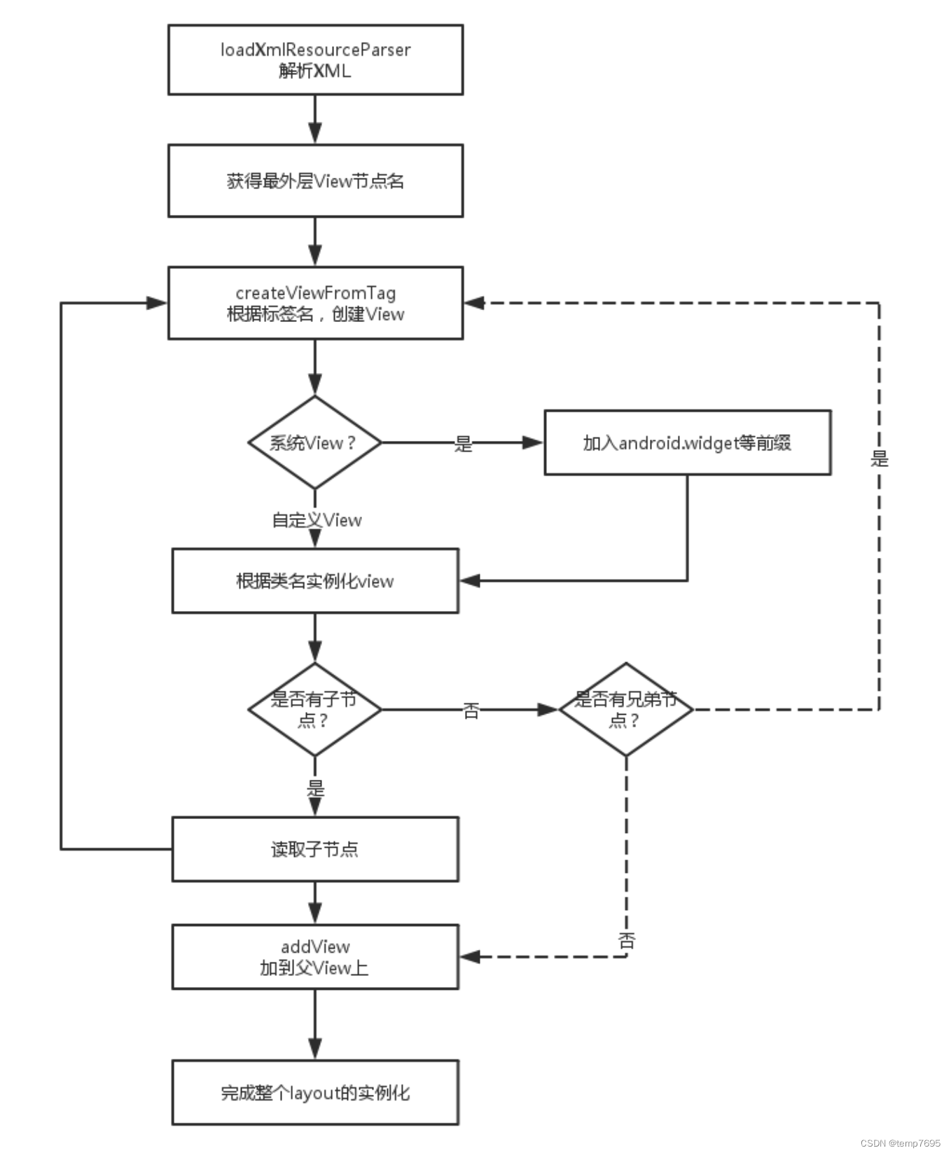 可以看到这是个递归过程, 不断寻找当前节点的所有子节点View标签,然后调用createViewFromTag进行实例化,随后调用viewGroup.addView(view, params);加到父view上,最终将所有view标签实例化之后,回到inflate, 调用root.addView(temp, params);将最外层标签加到inflate时传进来的父view上(如果非null的话)。整个过程如下: